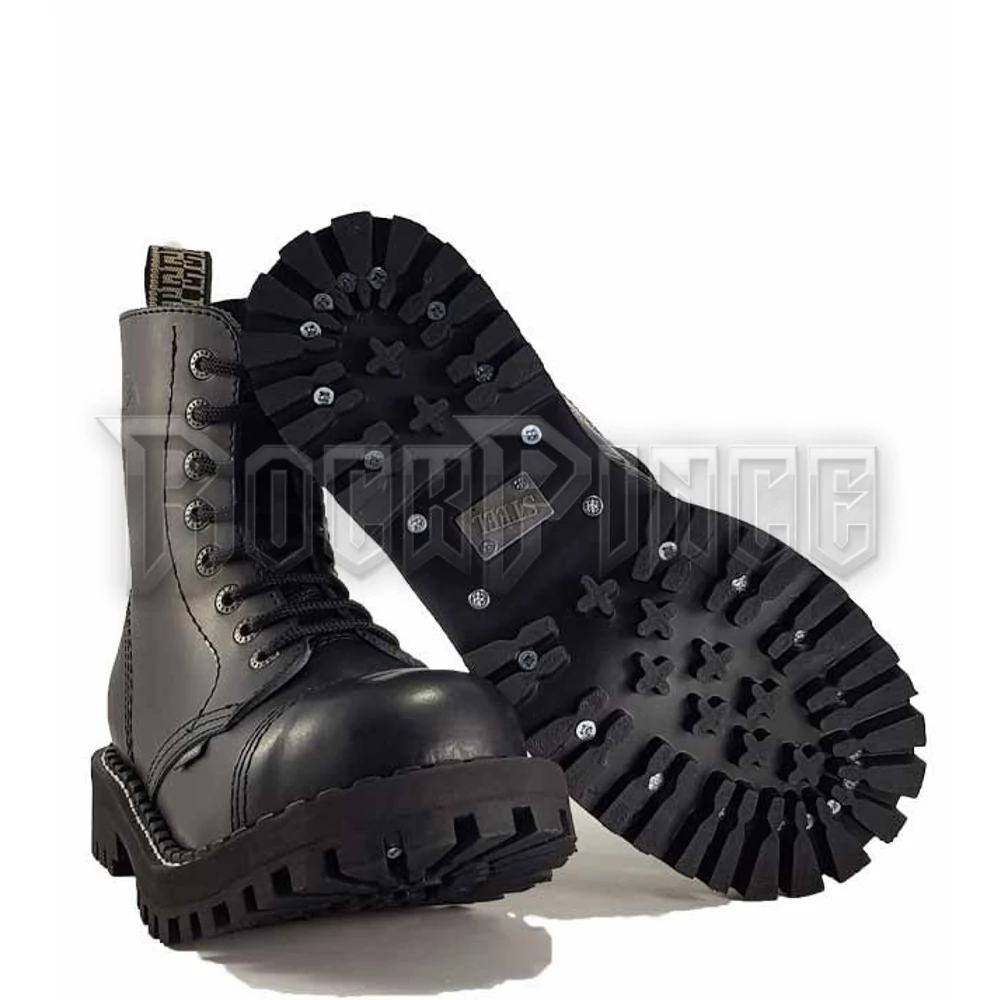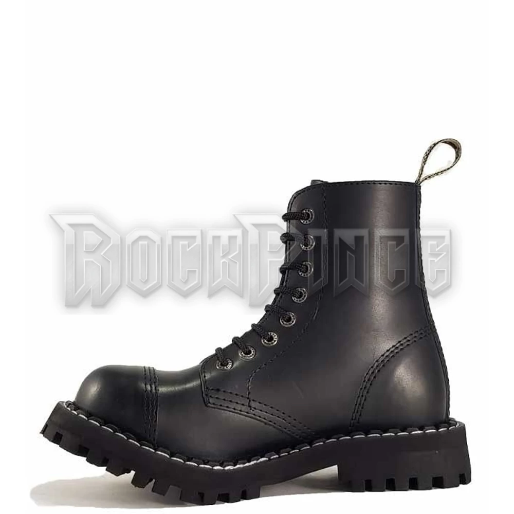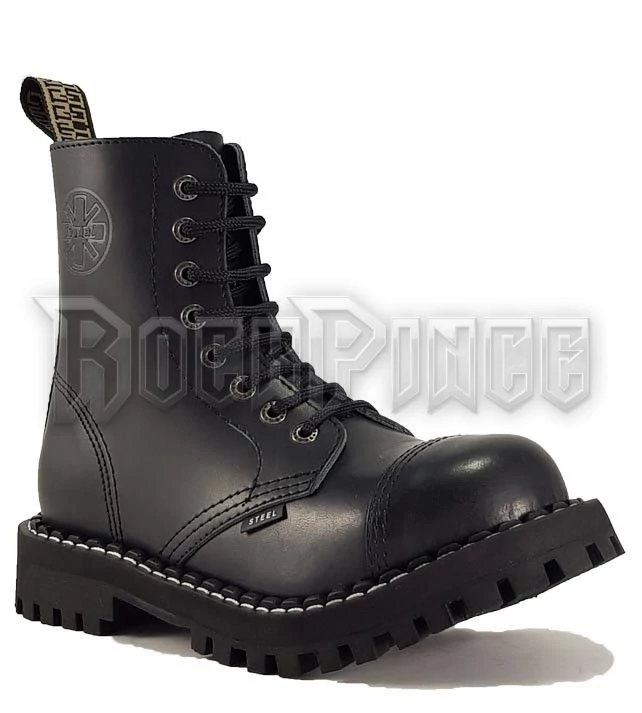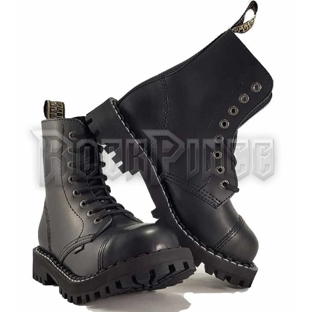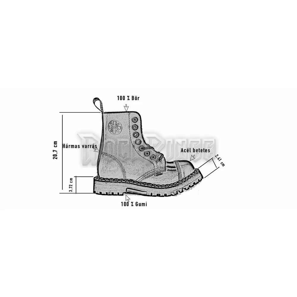 8 lyukú bakancs, bőr felsőrész, keményített gumitalp, hármas varrás, acélorr, flees talpbetét. Csavarozott talpú, acélbetétes.*